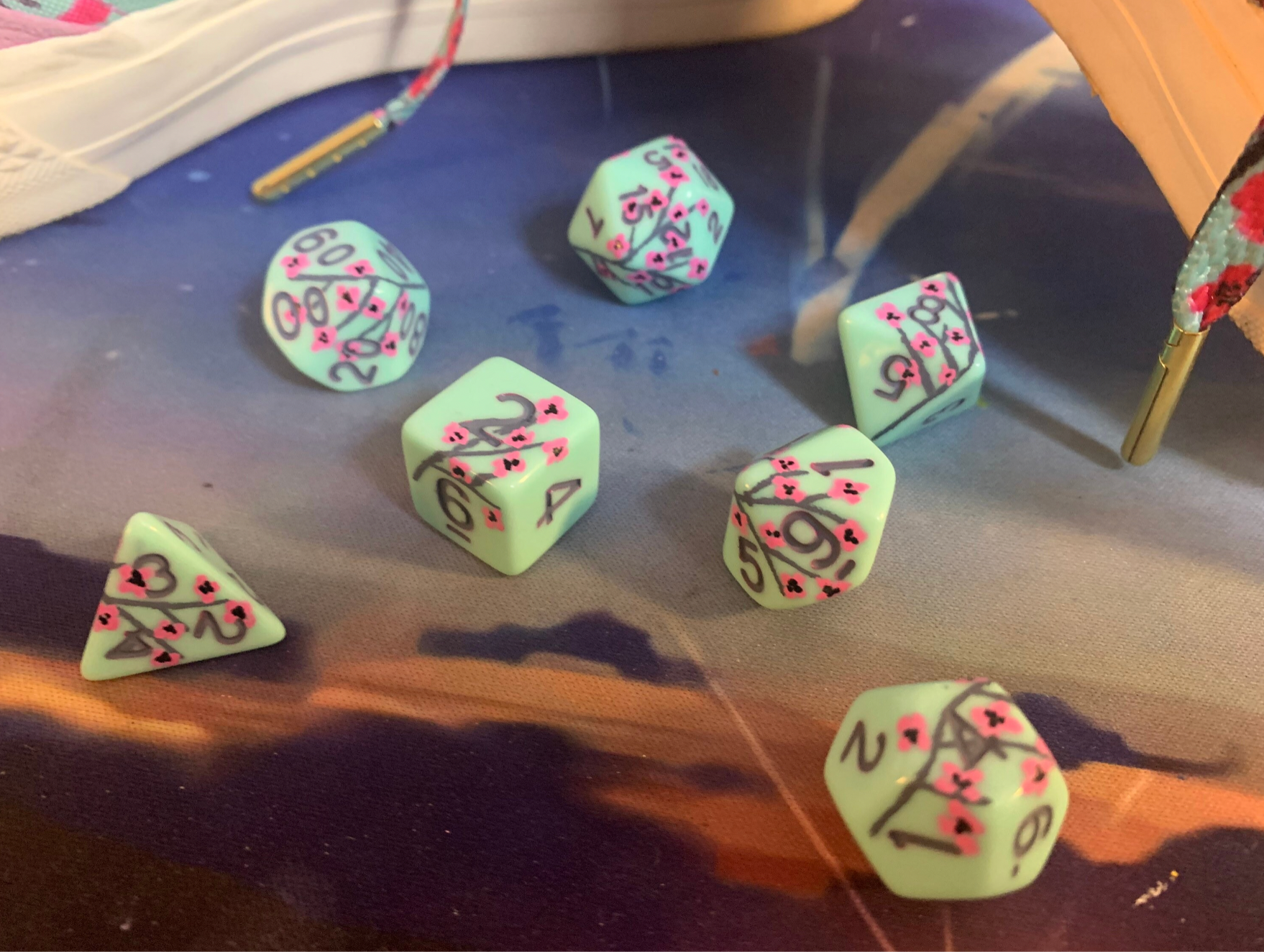 One set (7) of green dice inspired by Japanese cherry blossoms and green tea. They are decorated with paint pens and sprayed with a sealant.